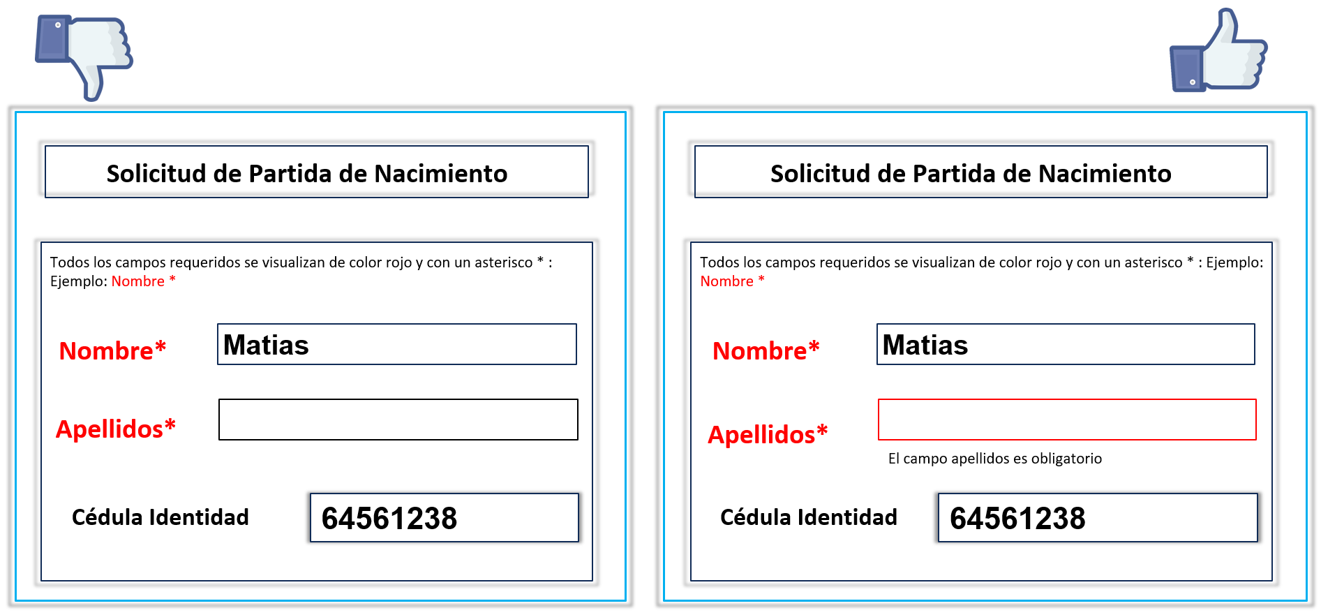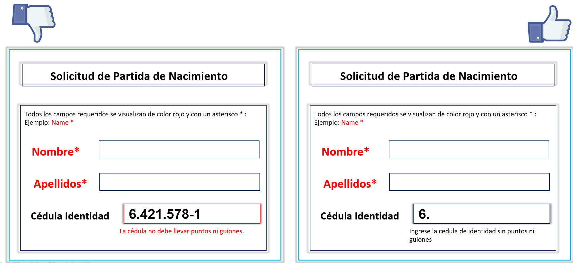 Debemos evitar que el usuario ingrese errores cuando se le puede informar con anterioridad el formato del contenido que debe ingresar, por ejemplo en el caso de la cédula de identidad que en ocasiones debe ser ingresada sin puntos ni guión y en otras sí deben incluirse.