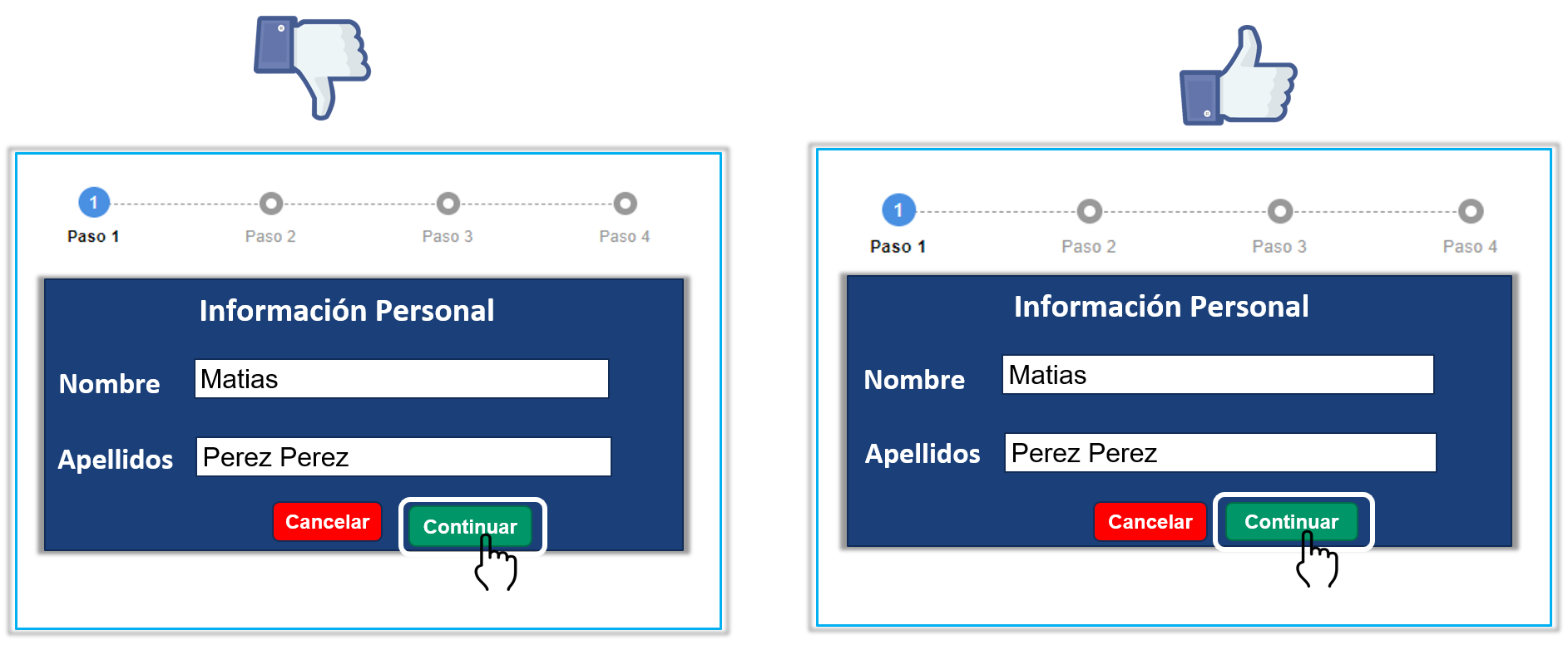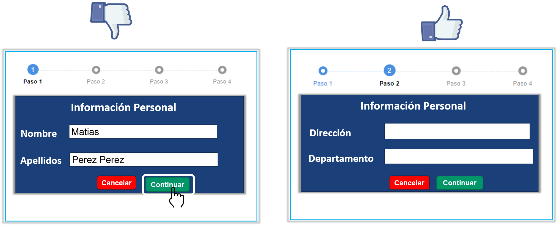 Debemos evitar que las opciones dejen de funcionar al hacer uso de los productos de apoyo. Como se intenta reflejar en el primer ejemplo, al habilitar el lector de pantalla y seleccionar la opción “Continuar” no se realiza la acción esperada (pasar al siguiente paso) y en este caso se mantiene visualizada la pantalla del Paso 1.
