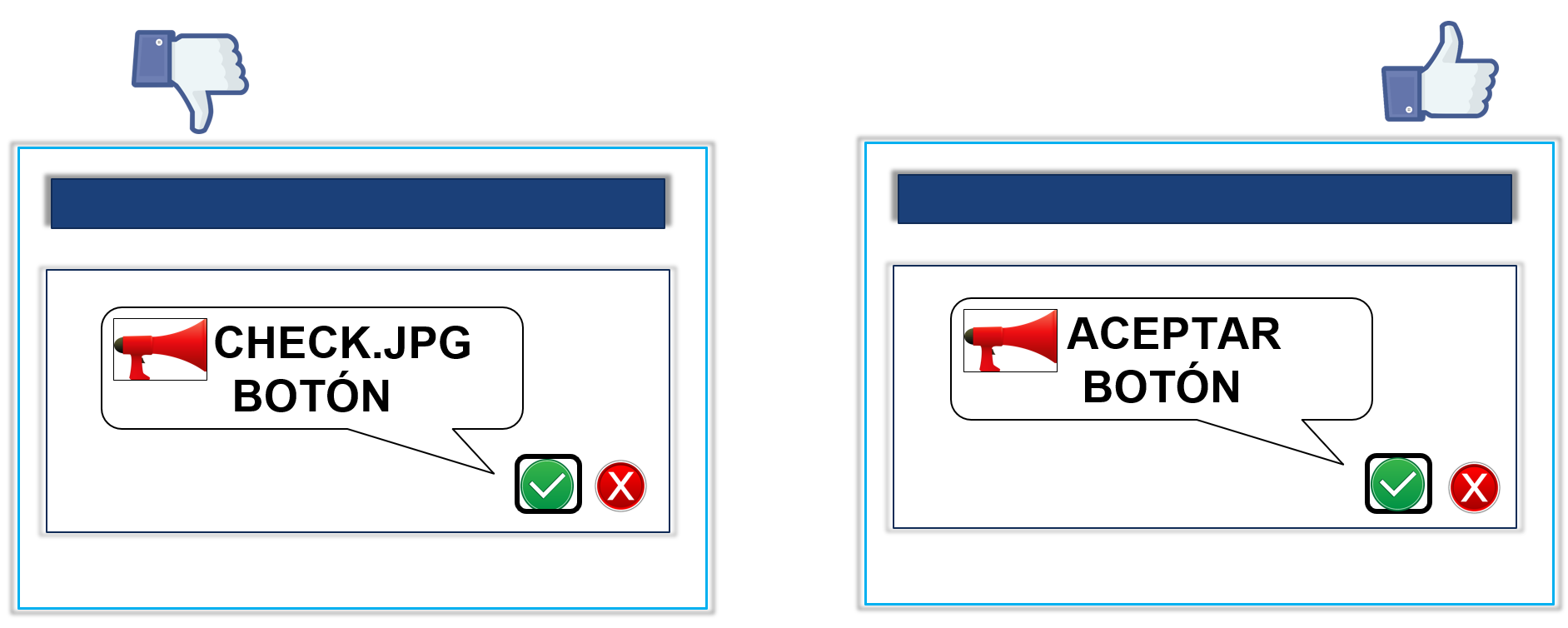 Por esto es importante que se defina un texto alternativo claro y descriptivo que le comunique al usuario qué está visualizando, como vemos en el segundo ejemplo que sería el botón “Aceptar”.